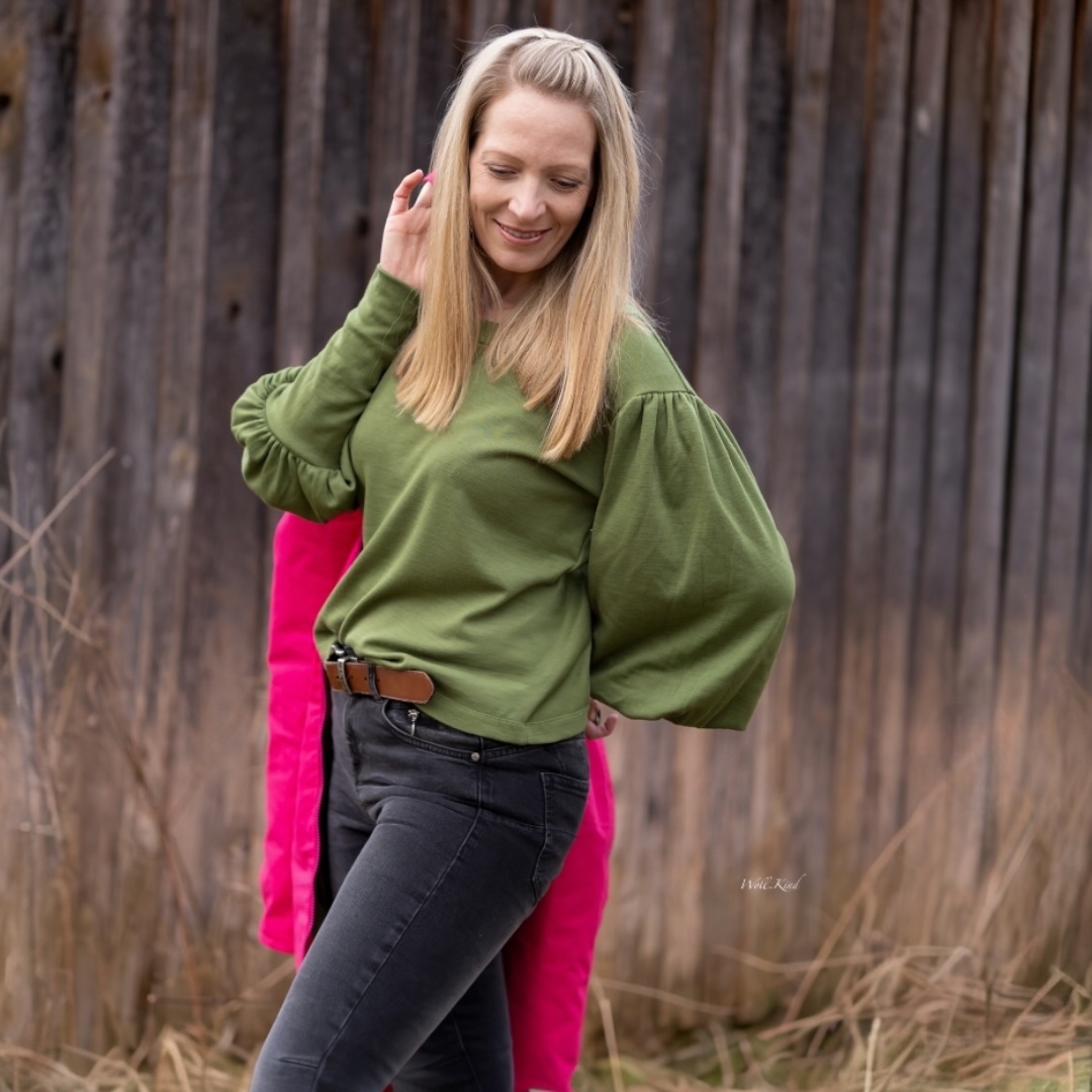 Schnittmuster: Simples Shirt von Klimperklein aus dem Buch Nähen mit Jersey Lieblingsmodelle für Erwachsene (Größe XXS-3XL) – KLIMPERGROSS! in Größe L, gekürzt, Saum begradigt und Bündchen dran.