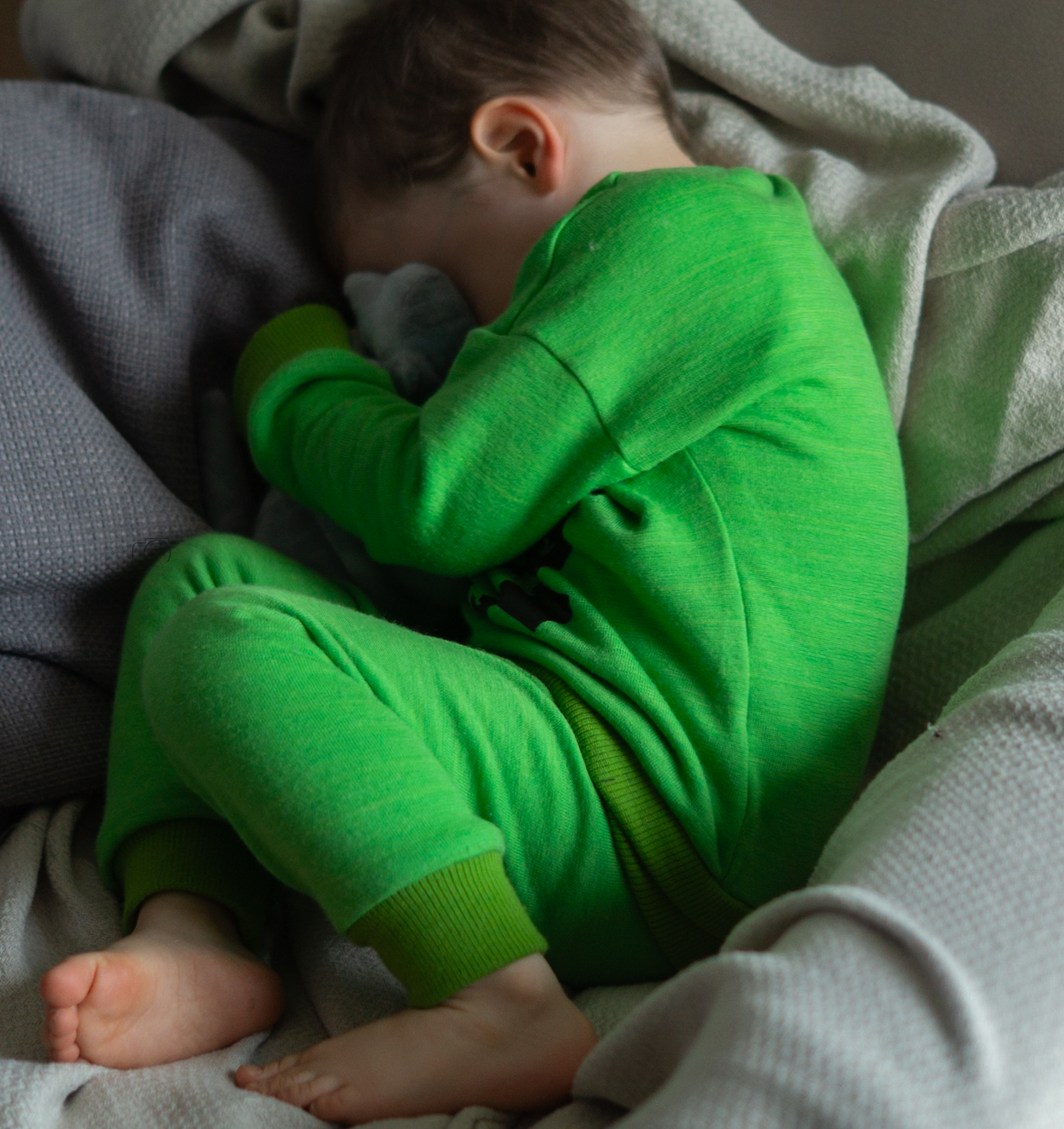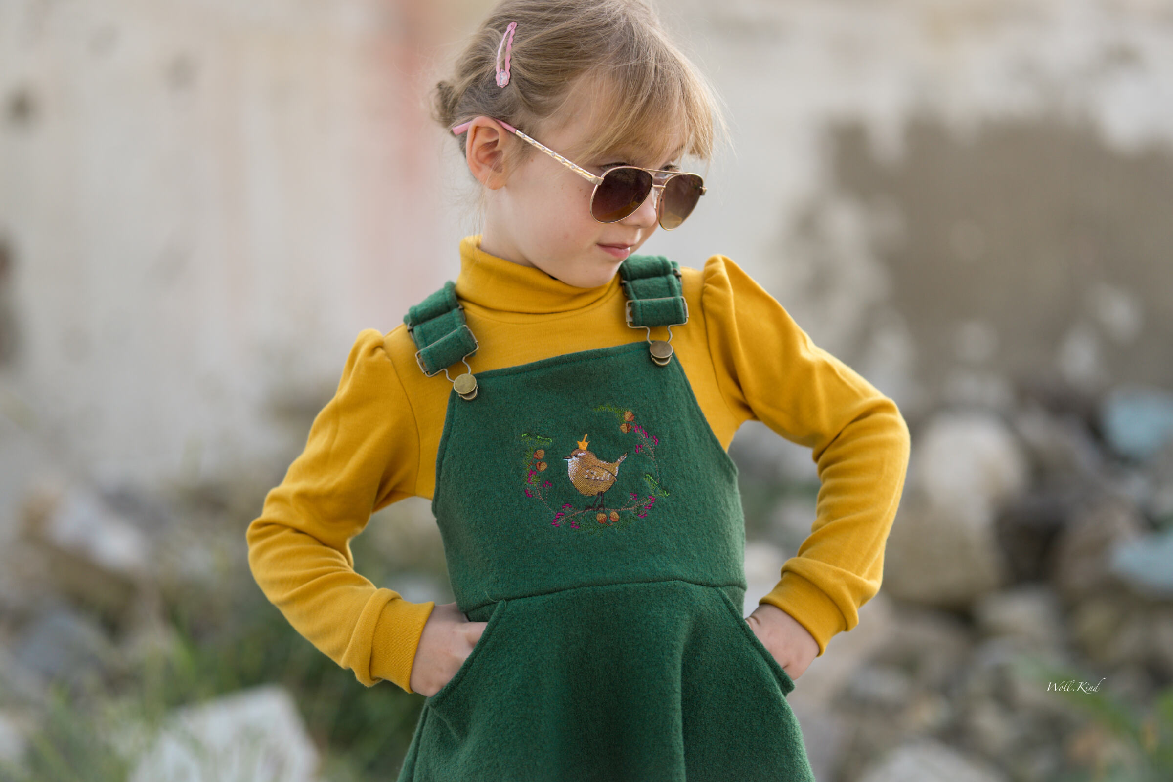 Material: Bio Tuchloden aus 100% Wolle – kiwi, Bio Tuchloden aus 100% Wolle – smaragdgrün, Bio Woll-Rippbündchen (schmal) – sommergrün, Bio Merinofleece – sommergrün, Bio Baumwollfleece – Stoffonkel – neongrün (nur für Kragen und Kapuze, da der Träger wollempfindlich ist), Ein Label zum Aufnähen – Dinosaurier reflektierend (3M™ Scotchlite™), 20 Motivkappen Tiger Snaps Dinosaurier, 1 reflektierender Jackenreißverschluss (teilbar), Baumwoll Köperband lindgrün (für Aufhänger), Reflektor Paspelband – dunkelgrau