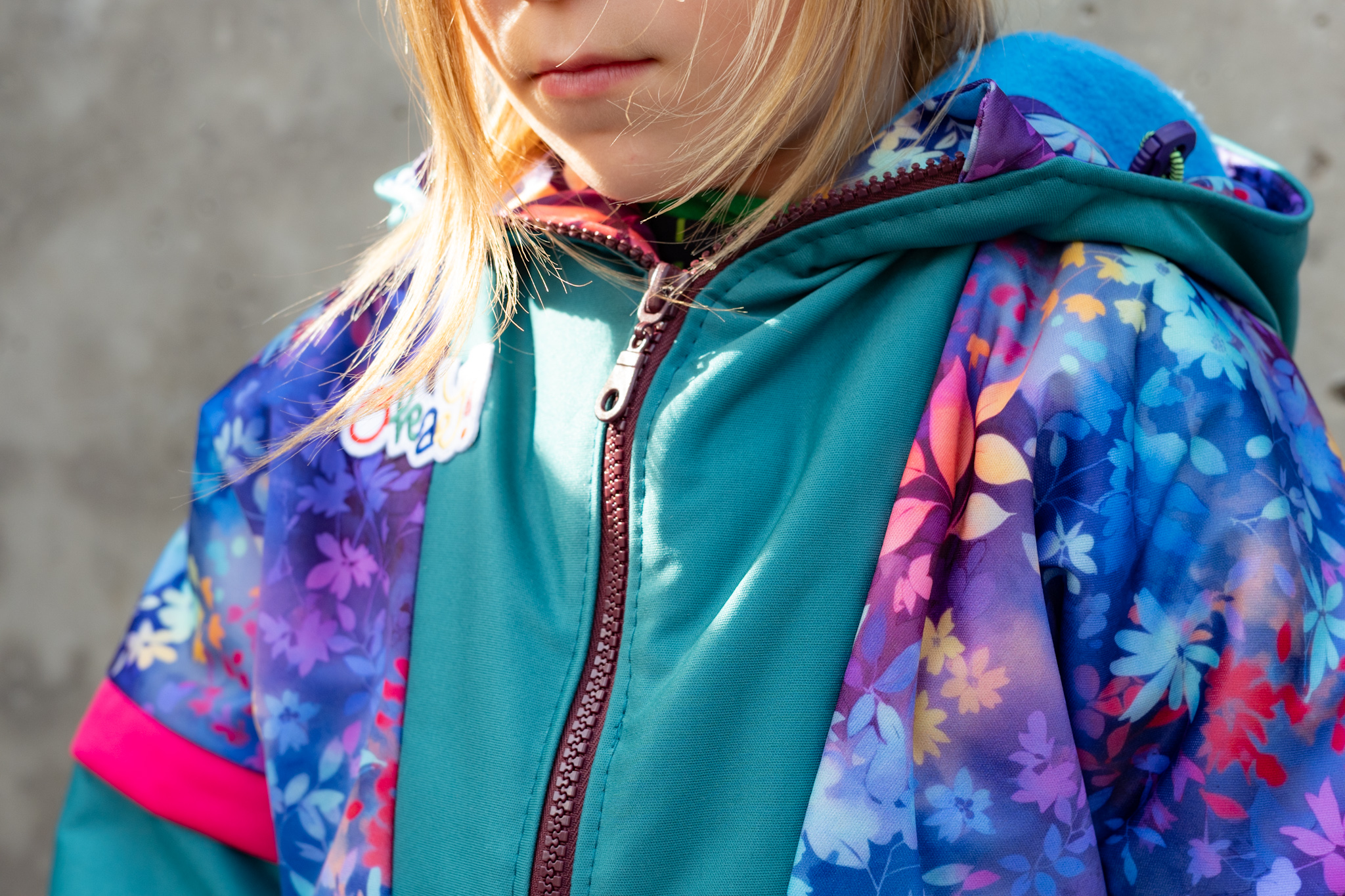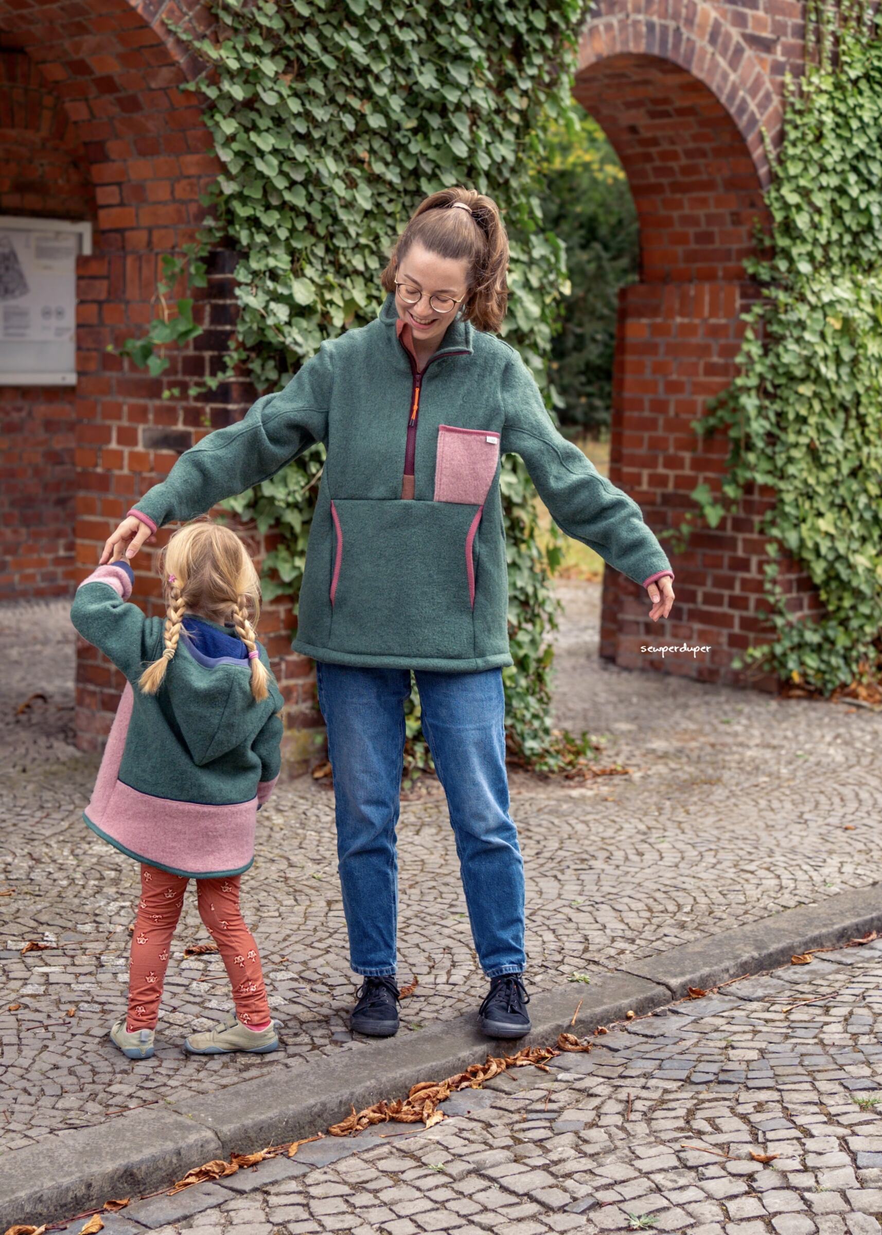 Material: Bio Tuchloden aus 100% Wolle – hibiskus, Bio Merinofleece – berry, Bio Woll-Rippbündchen (schmal) – himbeerpink, Ein teilbarer Metall Jackenreißverschluss (OPTI M60 mit Mosel Schieber) – 70cm – pink, Reflektor Paspelband – dunkelgrau, 2 reflektierende Kunstleder-Patches für Ösen – verschiedenen Größen, Multicolor Flechtkordel 6mm